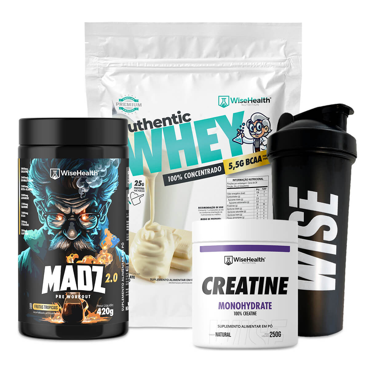 Combo: Whey 900g + Creatina 250g + MADZ 2.0 420g + Coqueteleira